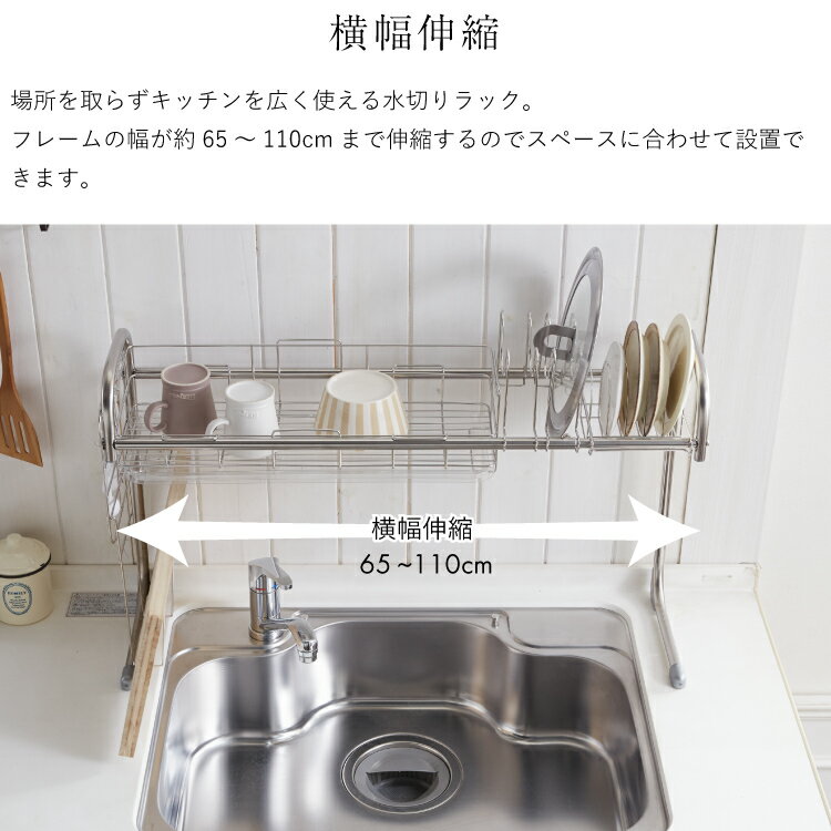 (約65cm〜110cm) ●水切りカゴは、ワイドタイプなので、鍋やフライパンを置く事も可能! ●キッチンで使用する小物の収納代わりにもなります。