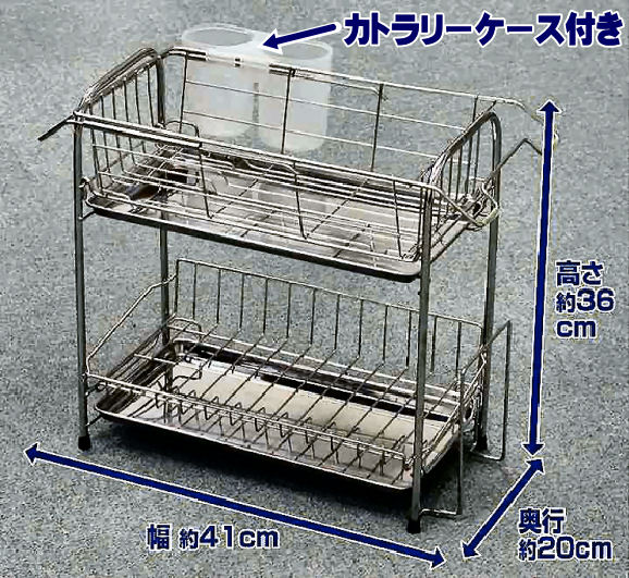 サイズ:幅41X奥行20X高さ36cm 材質:金属部/ステンレス鋼 水切りポケット/ポリプロピレン (耐熱温度90度)、 コンパクトでもたっぷり収納! 1 上段には皿12枚まで収納可能 2 可動式の箸・カトラリーホルダー 3 まな板スタンド付き 4 脚部にはシンク上を傷付けないよう ゴム足キャップ付き 5 オールステンレスで、サビと汚れに 強い水切りラック(水切りカゴ)サイズいろいろ水切りラック (おすすめポイント) 狭いスペースにも設置でき、 しっかり収納できるスリム2段仕様。